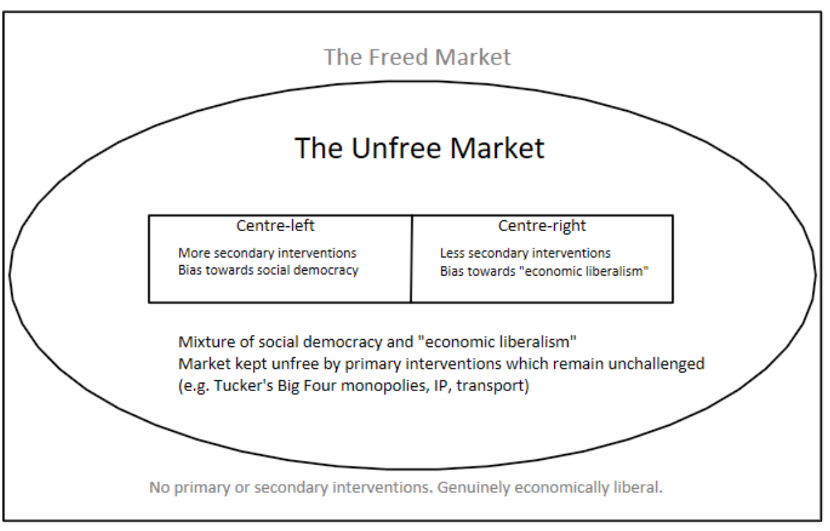 Chris Shaw has advocated supporting candidates with libertarian principles, such as Steve Baker and Douglas Carswell. Unless the (right-)Libertarian Party fields candidates, you are probably looking at the Conservative Party or UKIP. It would be very hard for me to swallow voting for these parties, but I have given it serious thought in this circumstance – and rejected the idea. Right-wing parties by definition support the continuation of economic inequality. The economic liberalism and ‘free market’ these parties advocate is newspeak, for they advocate the continuation of an unfree market, as I illustrate below: